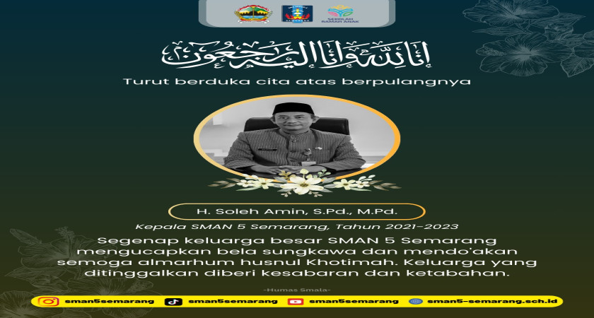 Sabtu, 21 Juni 2025. Kepala SMA N 5 Semarang periode 2021-2023 Bp. Soleh S.Pd,M.Pd. Telah meninggal dunia. Posisi sekarang menjabat sebagai Kepala SMA Karang Tengah Demak.